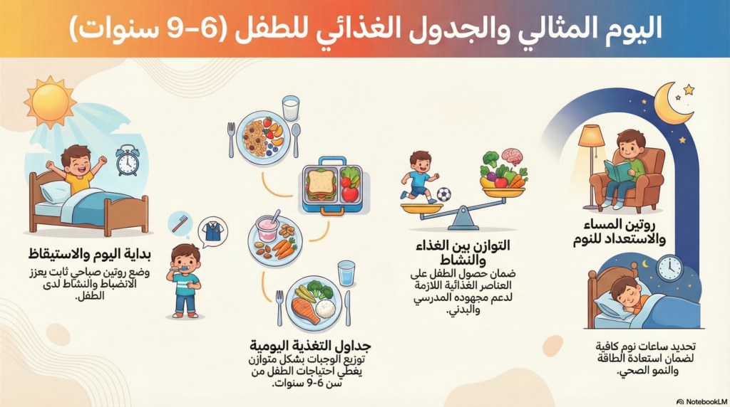 في هذا الدليل الشامل، ستجدين جدول تغذية عمليًا وواضحًا لطفلك من عمر 6 إلى 9 سنوات، مع أمثلة حقيقية للوجبات اليومية، وأفكار لانش بوكس سهلة التطبيق، وخطط مرنة تناسب الطفل النشيط أو الانتقائي أو حتى الذي يعاني من زيادة أو نقص في الوزن — تمامًا كما تم تنظيمه في محتوى المقال الأساسي لديك .