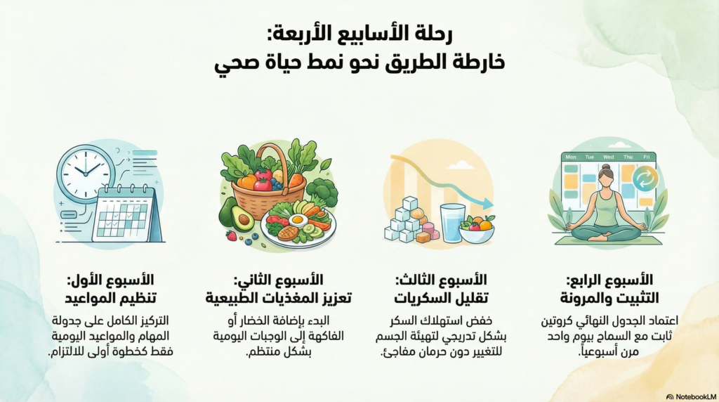 - تنظيم مواعيد الوجبات (كل 3–4 ساعات).