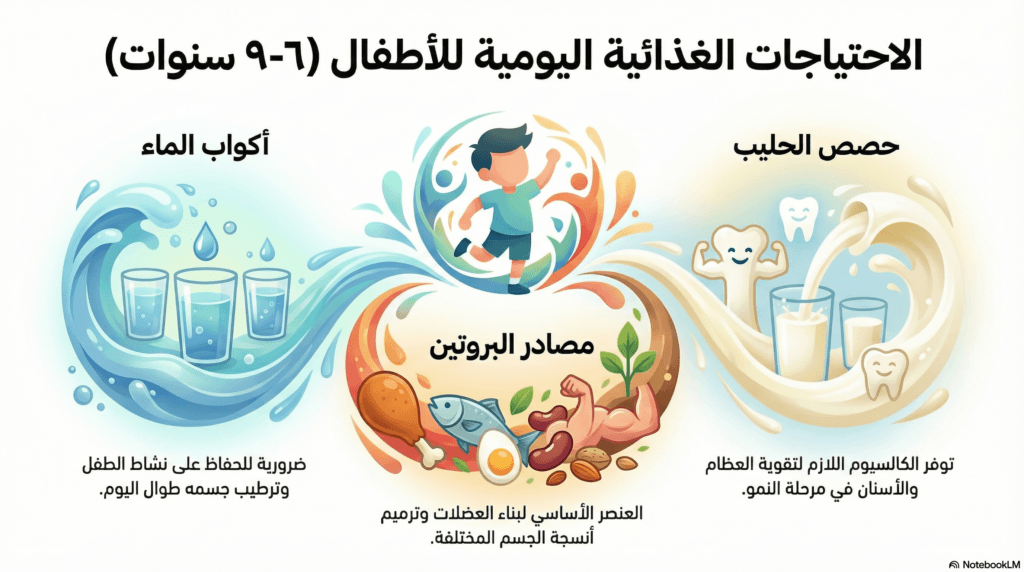| 9 سنوات | 5–7 أكواب ماء | 2.5–3 أكواب حليب | 25–28 جرام بروتين | اقتراب مرحلة البلوغ وبداية زيادة الاحتياج |