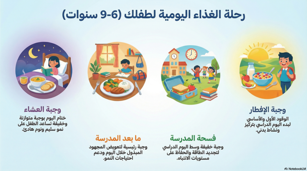 - جدول تغذية الطفل 6–9 سنوات: دليلك اليومي لوجبات صحية بدون عناء