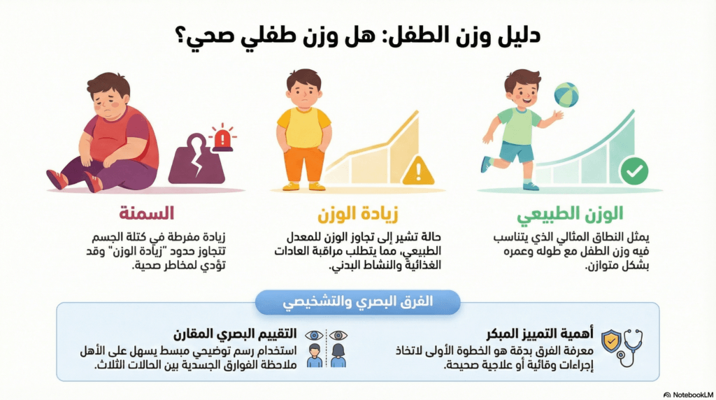 فبعض الأطفال يمرون بمرحلة امتلاء مؤقتة قبل طفرة النمو، ويُطلق على ذلك أحيانًا زيادة وزن طبيعية أو مؤقتة. أما السمنة المرضية فهي زيادة في الدهون تؤثر على صحة الطفل أو تعيق نشاطه اليومي.