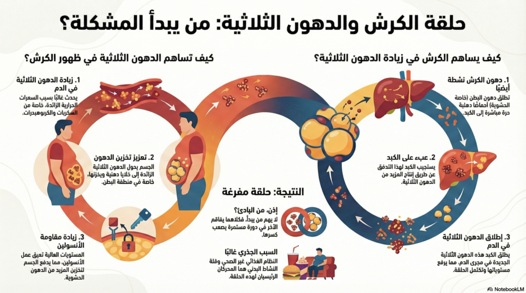 - النتيجة: ارتفاع الدهون الثلاثية + زيادة الكرش أكثر.