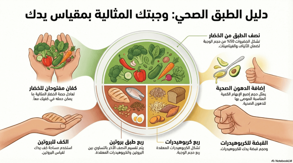 المعادلة الذهبية: ¼ بروتين + ¼ كربوهيدرات + ½ خضار + دهون صحية.