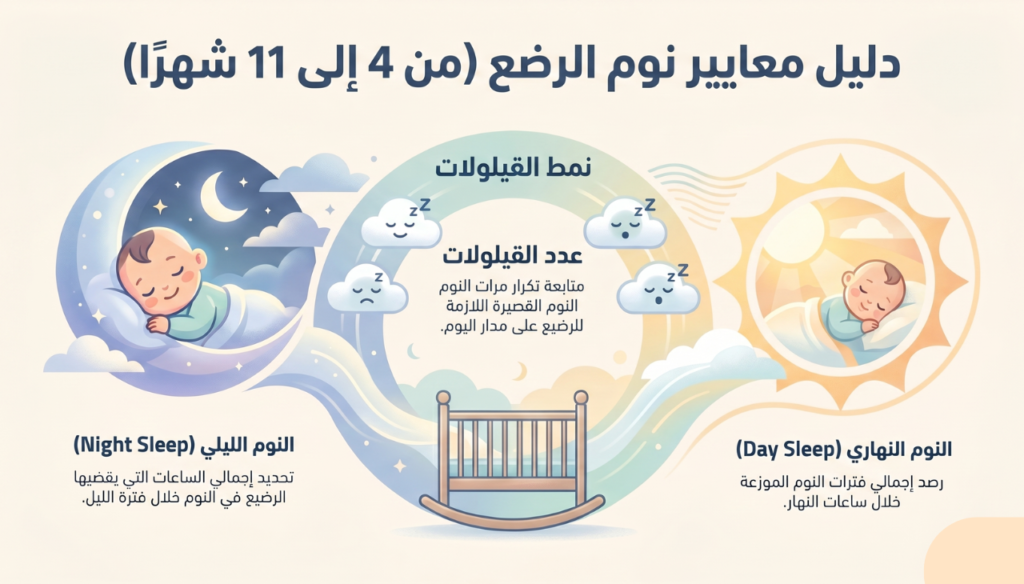 ينام الطفل في عمر 4 إلى 11 شهرًا ما بين 12 إلى 15 ساعة يوميًا، موزعة بين النوم الليلي والقيلولات النهارية.